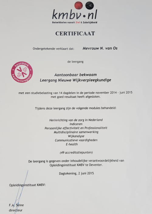 diploma’s en cursussen die zij volgt. Verpleegzorg Nicole heeft KIWA-